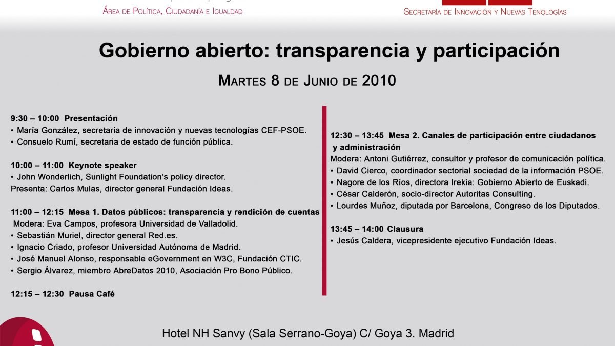 Siempre es interesante subir a Madrid, y siempre aprovecho para asistir a varios actos, reuniones,… por lo pronto y en lo que va de día (lo cierto es que hoy y con la dichosa huelga de trenes he tenido que salir de casa a las 5:00 con lo que no tengo muy claro si estaré a la altura) ya llevo tres y aún me queda alguna más. Pero… centrémosnos, esta mañana ha sido muy positivo asistir a las Jornadas que la Fundación Ideas ha organizado denominadas: «Gobierno Abierto: transparencia y participación»: