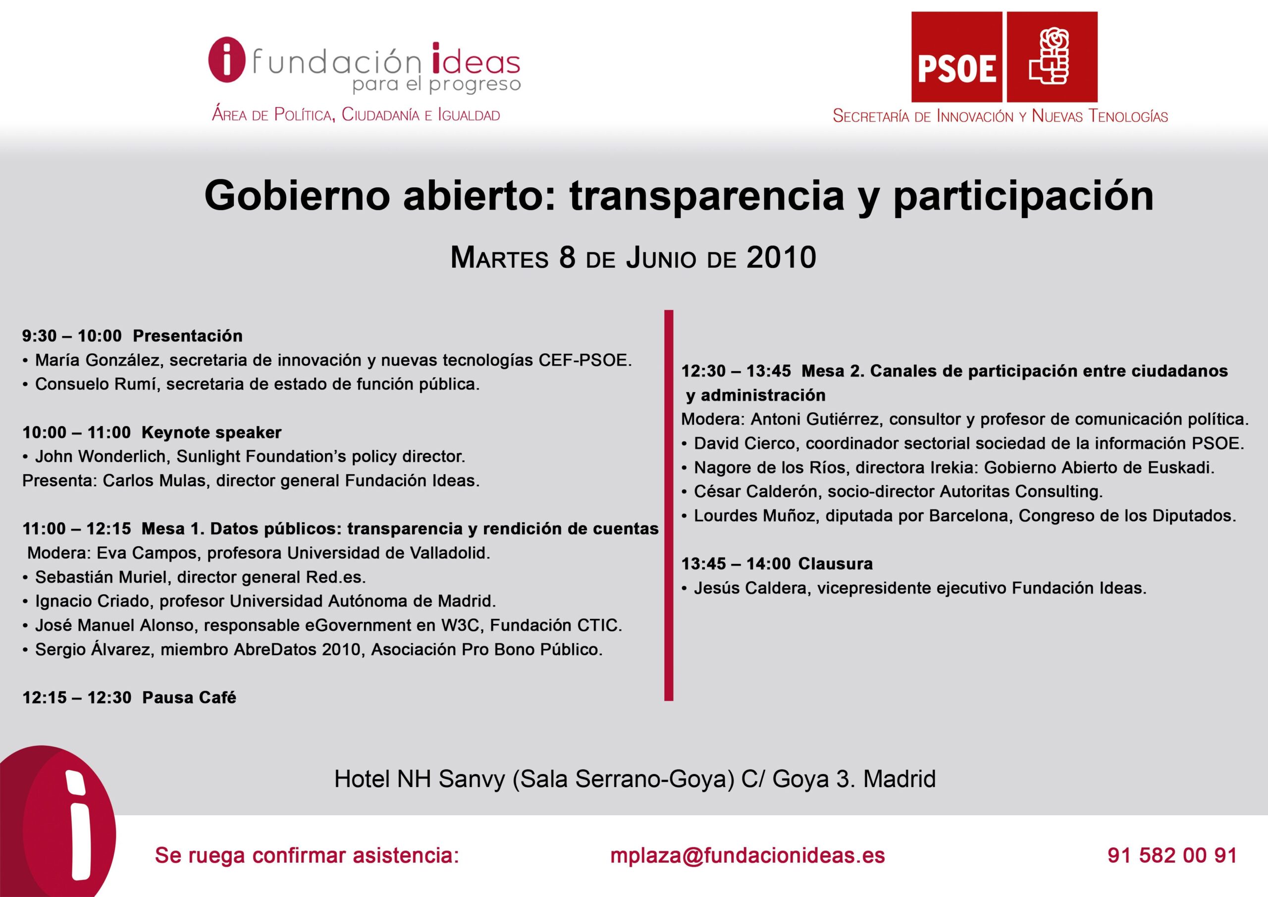 Siempre es interesante subir a Madrid, y siempre aprovecho para asistir a varios actos, reuniones,… por lo pronto y en lo que va de día (lo cierto es que hoy y con la dichosa huelga de trenes he tenido que salir de casa a las 5:00 con lo que no tengo muy claro si estaré a la altura) ya llevo tres y aún me queda alguna más. Pero… centrémosnos, esta mañana ha sido muy positivo asistir a las Jornadas que la Fundación Ideas ha organizado denominadas: «Gobierno Abierto: transparencia y participación»: