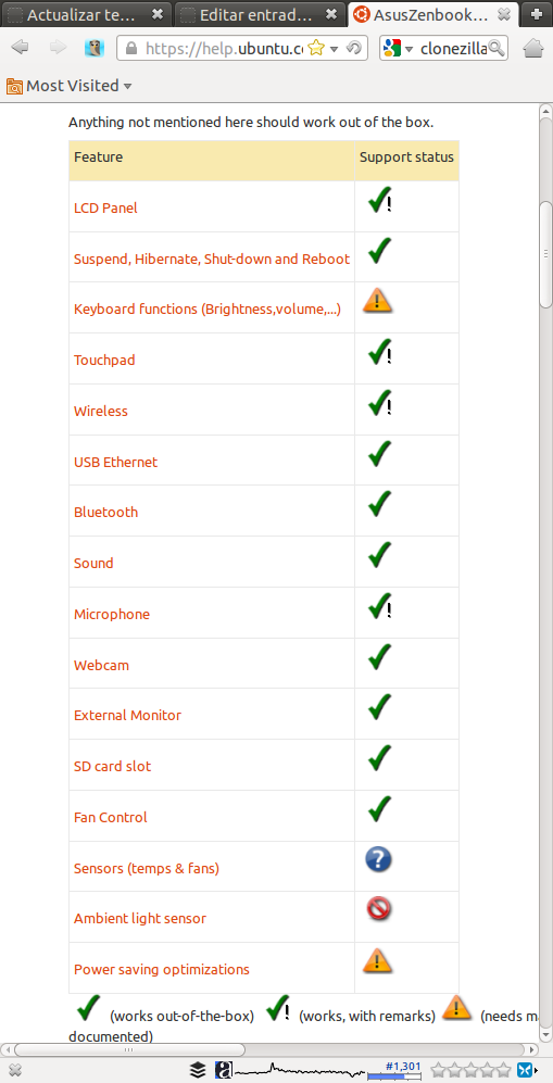 Aunque el equipo con Ubuntu 12.04 funciona bastante veloz y cuasiperfecto, aún existen algunas funciones que no funcionan de teclas, así como algunas características muy concretas. A diferencia de lo que dicen otros usuarios, a mí si que me funcionan casi todas las teclas de función, incluidas las de bajar o subir la luz del teclado, y la única que por el momento se resisten es subir y bajar brillo de la pantalla, pero… he de decir que no he probado ninguno de los scripts descritos en la página de ayuda de ubuntu.