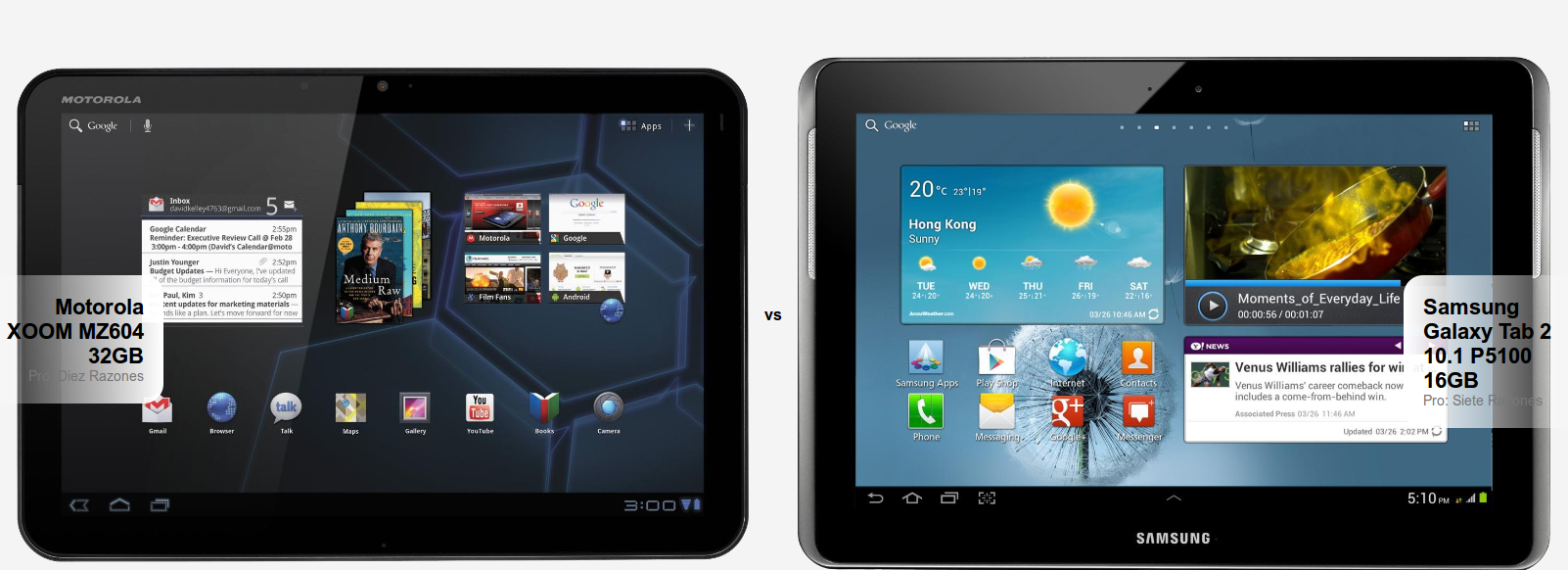 Gracias a versus, podemos además compararlos con todo lujo de detalles técnicos, siendo asombroso que en dicha comparativa, sean más las razones para decantarse por el Motorola Xoom (10 razones) que por el Samsung Galaxy Tab (7 razones).