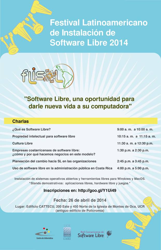 Realmente FLISOL dejó de ser hace ya mucho un evento para instalar Linux, o configurarlo, y se ha convertido más en un encuentro de apasionados de la libertad tecnológica, una oportunidad de juntarte con amigos de la Comunidad. Y este año tendré el honor de participar en FLISOL en San Jośe de Costa Rica, teniendo además el honor de impartir la primera conferencia, y aunque no sé si podré quedarme todo el tiempo, espero estar gran parte del día. Así que, ya sabes, ¿te vienes al FLISOL 2014?