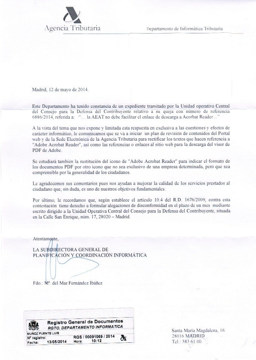 Pasaron dos meses y cuando en marzo de 2014 miro la información para realizar la declaración de la renta, cuando veo los habituales iconos de Adobe para indicar los ficheros pdf y el típico enlace para descargar el Adobe Acrobat Reader, me doy cuenta del disparate: una administración pública usa una marca comercial para referirse a un estándar, el ISO 19005, e incluso facilita su descarga en detrimento de otras opciones. Y me pasa lo mismo cuando miro la información para la matrícula del colegio.