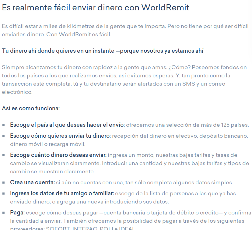 WorldRemit: Plataforma también muy visual y en castellano. Es por muchos la considerada más rápida y confiable para usarse desde el móvil. Además, me da la sensación que es la que más opciones para recibir dinero tiene, desde cuenta, tarjeta, teléfono, hasta puerta a puerta. Eso si, como el resto, uno de los principales escollos para mi es que no me permite enviar dinero desde casi ningún país americano, solo Brasil, Canadá y USA. No he podido ver qué tipo de cambio te aplican ni la comisión correspondiente, solo la que yo hice inicial de 125 €, cuya comisión era 3,99 €, que en la primera transferencia si pones el código FREE no te cuesta nada y te descuentan los gastos.