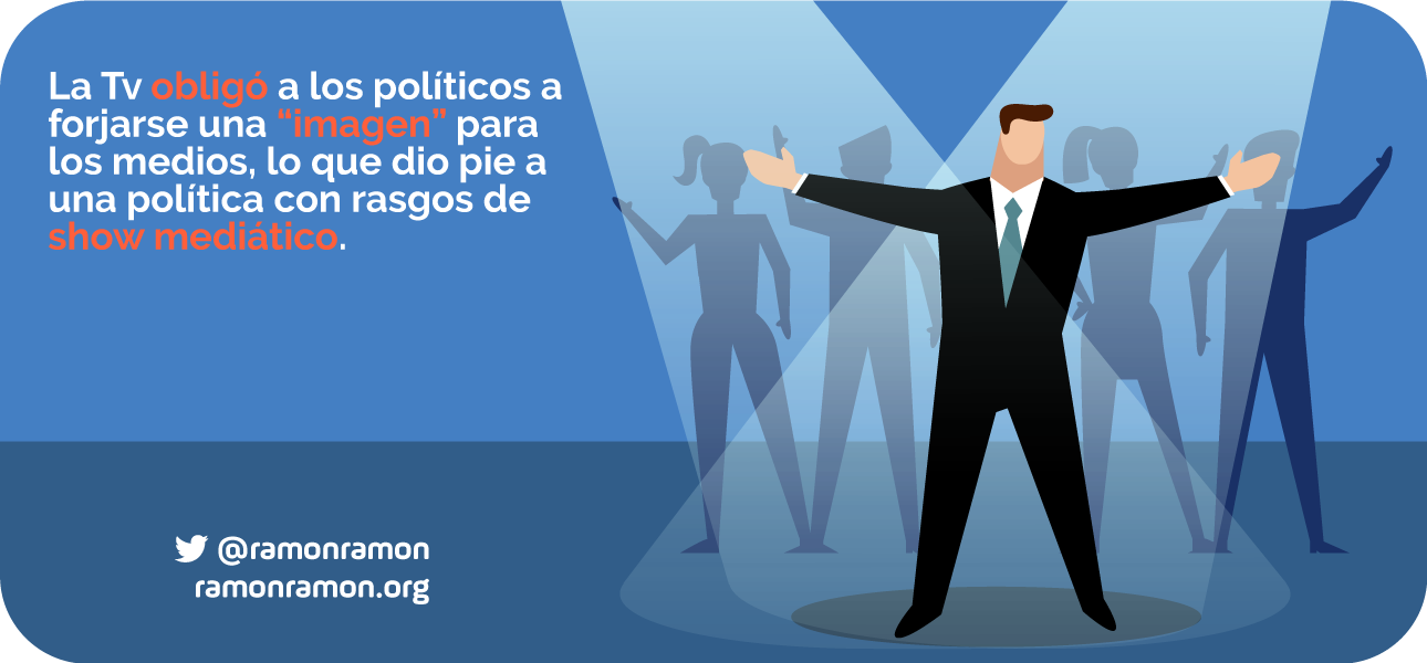 Los formatos de la televisión, con su tiempo delimitado y categorizados por segmento, hicieron necesario que el mensaje a enviar por los políticos fuera más preciso y entretenido que el utilizado en la radio o en los periódicos, además de obligarlos a forjarse una “imagen” para los medios, ahora audiovisuales, lo que dio pie a la ya mencionada transición de la política tradicional hacia una política con rasgos de show mediático y de culto al carisma de los dirigentes.