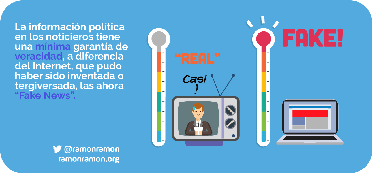 Por otro lado, al ser la televisión tradicional un medio regulado por ciertas leyes y preceptos morales y periodísticos, la información política brindada en los programas informativos o noticiosos está acompañada de una mínima garantía de veracidad, a diferencia de la que se puede encontrar en Internet, que pudo haber sido inventada o tergiversada a conveniencia (las ahora tan citadas fake news).