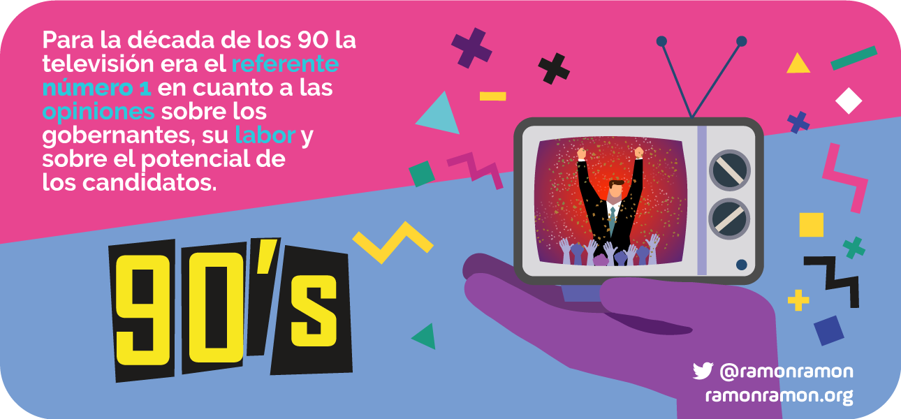 Para la década de los 90 la televisión era el referente número 1 en cuanto a las opiniones sobre la gestión de los gobernantes y sobre el potencial de los candidatos. En resumidas cuentas, la televisión estableció una manera amena de relacionarse con la política que la gente adoptó y aún conserva.